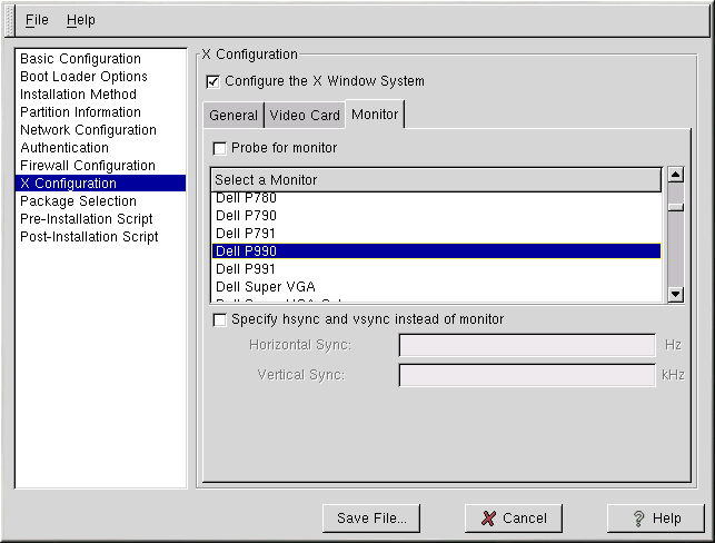 Alternatively, you can select your monitor from the list. You can also specify the horizontal and vertical sync rates instead of specifying a monitor by checking the Specify hysnc and vsync instead of monitor option. This option is useful if the monitor for the system is not listed. Notice that when this option is enabled, the monitor list is disabled.