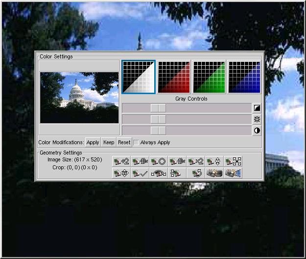 If you want a quick and simple way of viewing one file, Electric Eyes may be for you. To start Electric Eyes from a GNOME desktop, choose Main Menu => Programs => Graphics => Electric Eyes. For KDE users, choose Start Application => Programs => Graphics => Electric Eyes. You can also type ee at a shell prompt. Right-click the Electric Eyes logo to open the pop-up menu and load an image. Right-click on displayed images to configure certain aspects of the image as well as the Electric Eyes environment.