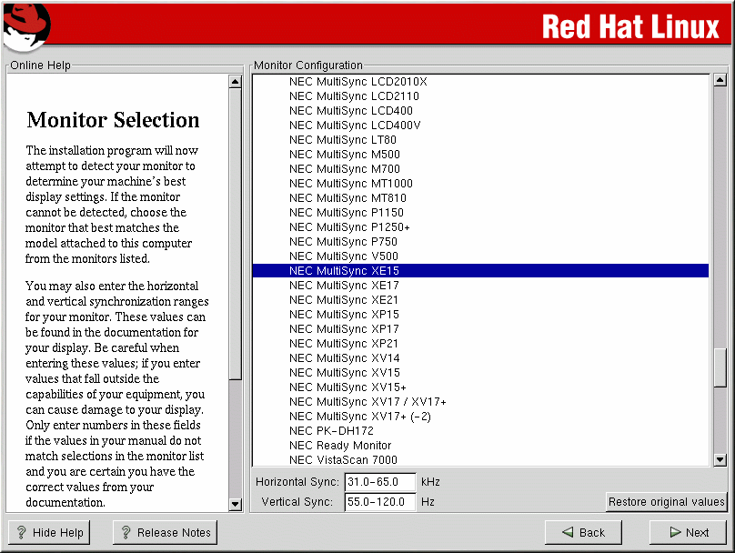 If your monitor does not appear on the list, select the most appropriate Generic model available. By selecting a Generic monitor, Xconfigurator will suggest horizontal and vertical sync ranges. These values are generally available in the documentation which accompanies your monitor, or from your monitor's vendor or manufacturer; please check your documentation to make sure these values are set correctly.