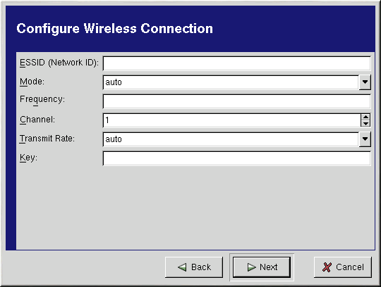 Wireless Ethernet devices are becoming increasingly popular. The configuration is similar to the Ethernet configuration except that it allows you to configure ESSID, mode, frequency, channel, transmit rate, and key for your wireless device.