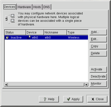 The installation program usually detects supported wireless Ethernet devices and prompts you to configure them. If you configured them during the installation program, they will already appear in the hardware list on the Hardware tab. |