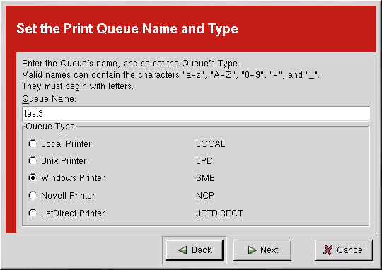 Select Windows Printer from the Queue Type menu, and click Next. If the printer is attached to a Microsoft Windows system, choose this queue type.