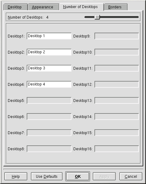 You can also change the number of desktops available to you by adjusting the slider at the top of the Desktops tab. For more desktops, drag the bar to the right; for fewer desktops, drag the bar to the left.