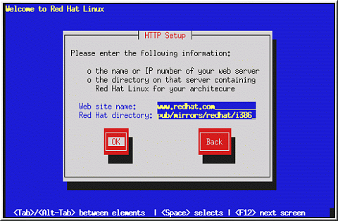 Enter the name or IP address of the HTTP site you are installing from, and the name of the directory there containing the RedHat installation files for your architecture. For example, if the HTTP site contains the directory /mirrors/redhat/i386/RedHat, enter /mirrors/redhat/i386.