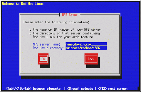 If the NFS server is exporting a mirror of the Red Hat Linux installation tree, enter the directory which contains the RedHat directory. (If you do not know this directory path, ask your system administrator.) For example, if your NFS server contains the directory /mirrors/redhat/i386/RedHat, enter /mirrors/redhat/i386.