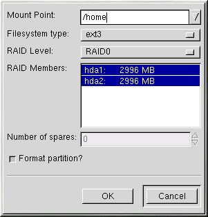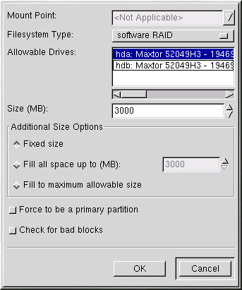 If you are making a RAID partition of /boot, you must choose RAID level 1 and it must use one of the first two drives (IDE first, SCSI second). If you are not creating a RAID partition of /boot, and you are making a RAID partition of /, it must be RAID level 1 and it must use one of the first two drives (IDE first, SCSI second). |