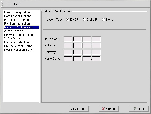 There are three network configuration options: DHCP, Static IP, and None. If there is not an Ethernet card in the system, choose None.