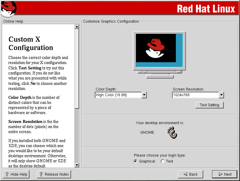 Choose the correct color depth and resolution for your X configuration. Click Test Setting to try out this configuration. If you do not like what you see during the test, click No to choose another resolution.
