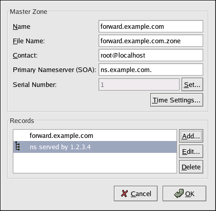 File Name — File name of the DNS database file, relative to /var/named. It is preset to the domain name with .zone appended to it.