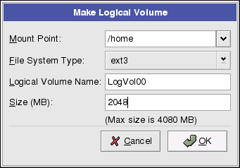 Create logical volumes with mount points such as /home. Remember that /boot can not be a logical volume. To add a logical volume, click the Add button in the Logical Volumes section. A dialog window as shown in Figure 10-3 will appear.