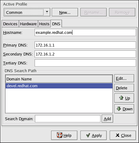 The DNS tab allows you to configure the system's hostname, domain, name servers, and search domain. Name servers are used to look up other hosts on the network.