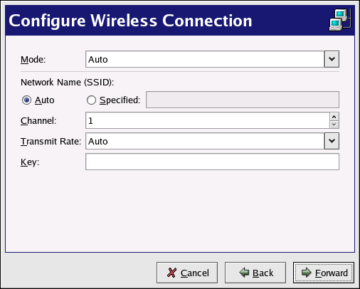 Wireless Ethernet devices are becoming increasingly popular. The configuration is similar to the Ethernet configuration except that it allows you to configure ESSID, mode, frequency, channel, transmit rate, and key for your wireless device.