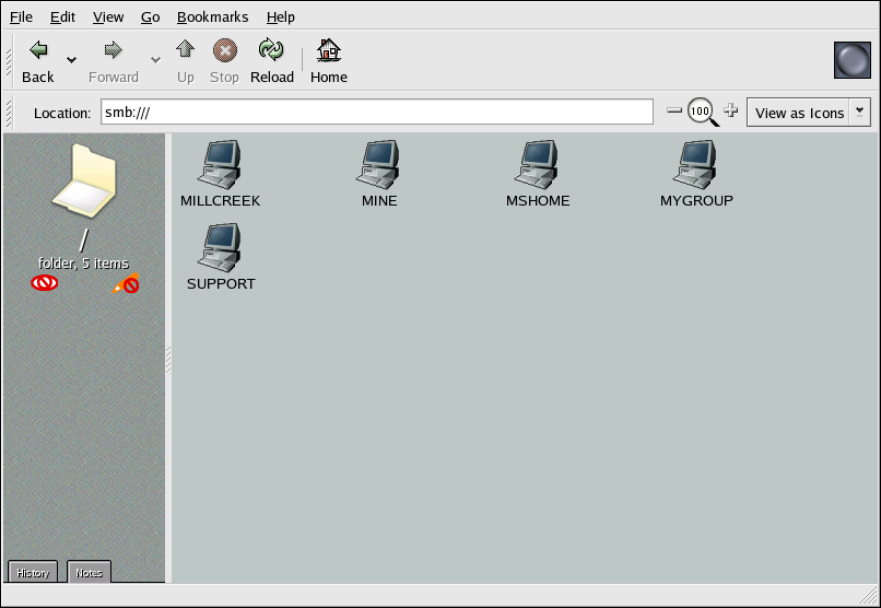 You can also use Nautilus to view available Samba shares on your network. On the GNOME desktop, go to the Main Menu Button (on the Panel) => Programs => Applications => Nautilus to open a Nautilus window. Type smb: in the Location: bar.