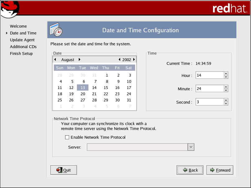 Setup Agent allows you to set your machine's date and time, or lets you synchronize your date and time with an network time server — a machine that sends date and time information to your machine through a network connection. Set the day, month, and year using the calendar tool and set your time in hours, minutes, and seconds using provided text boxes. Once you have set your time and date, click Forward to continue.