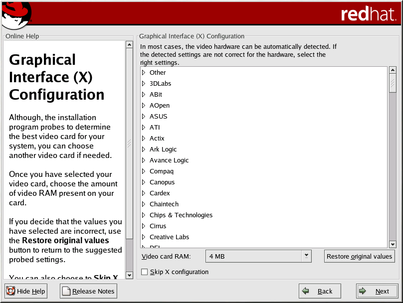Next, enter the amount of video memory installed on your video card. If you are not sure, please consult the documentation accompanying your video card. You will not damage your video card by choosing more memory than is available, but the X server may not start correctly if you do.