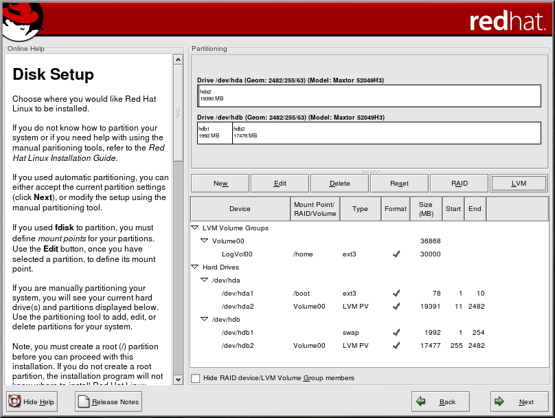 LVM can be configured during the graphical installation of Red Hat Linux or during a kickstart installation. You can use the utilities from the lvm package to create your LVM configuration, but these instructions will focus on using Disk Druid during the Red Hat Linux installation to complete this task.