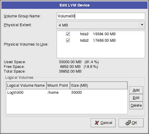 3. All logical volumes inside the volume group must be allocated in physical extent units. By default, the physical extent is set to 4 MB; thus, logical volume sizes must be divisible by 4 MBs. If you enter a size that is not a unit of 4 MBs, the installation program will automatically select the closest size in units of 4 MBs. It is not recommended that you change this setting.