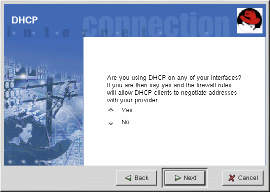 If you are using DHCP to activate any Ethernet interfaces on the system, you must say Yes to the DHCP question. If you say no, you will not be able to establish a connect using the Ethernet interface. Many cable and DSL Internet providers require you to use DHCP to establish an Internet connection.