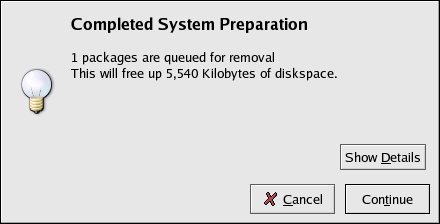 When you are finished selecting packages to remove, click the Update button in the main window. The application computes the amount of disk space that will be freed as well as the software package dependencies. If other packages depend on the packages you selected to remove, they will be automatically added to the list of packages to be removed. Click the Show Details button to view the list of packages to be removed.