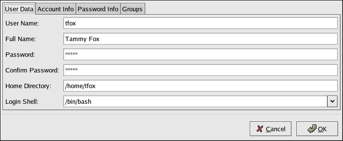 To view the properties of an existing user, click on the Users tab, select the user from the user list, and click Properties from the button menu (or choose File => Properties from the pull-down menu). A window similar to Figure 24-3 will appear.