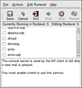 Services Configuration Tool lists the services from /etc/rc.d/init.d as well as the services controlled by xinetd. Click on a service to display a brief description of that service at the bottom of the window.