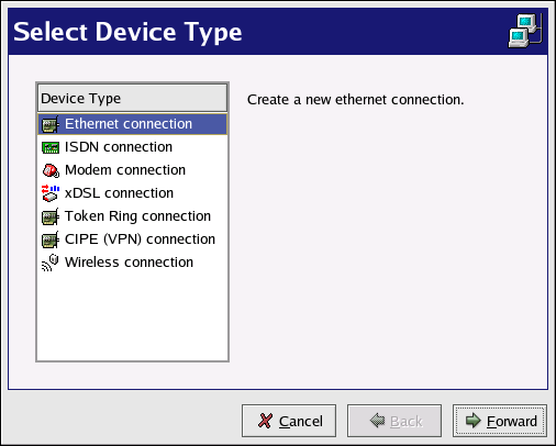 If you are connecting your Red Hat Linux computer to a wireless access point (WAP) or peer-to-peer (also called ad-hoc) network with a wireless (802.11x) network card, then you will need to configure your wireless device. Choose the Wireless Connection, then select the device from the list provided. You can then configure the device for DHCP or fixed IP addresses In the pop-up device configuration window.