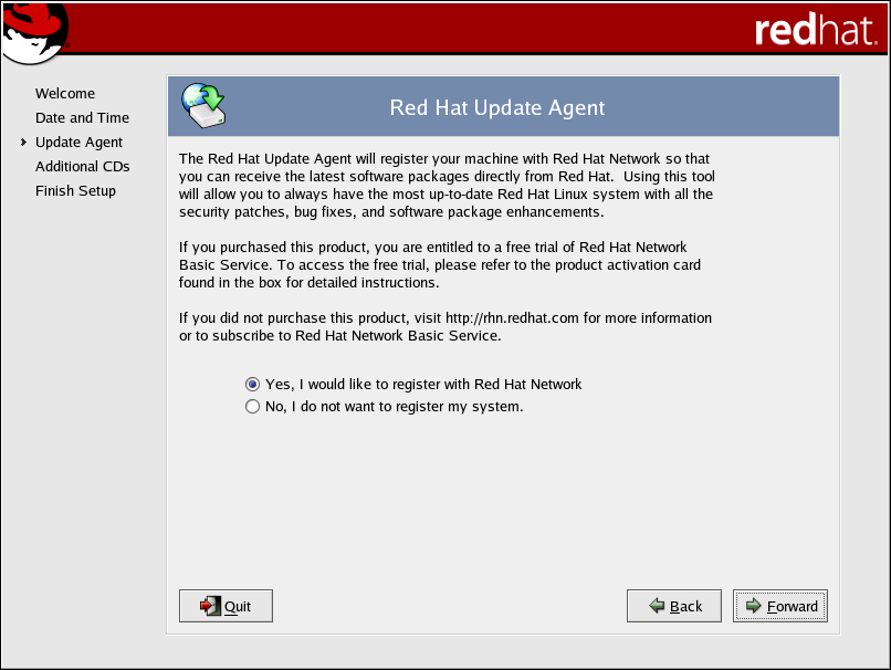 If you wish to register your system with the Red Hat Network and receive automatic updates of your Red Hat Linux system, choose Yes, I would like to register with Red Hat Network. This will start the Red Hat Update Agent — a utility that guides you step-by-step through the registration of your machine with the Red Hat Network. Selecting No, I do not want to register my machine skips the registration. For more information about Red Hat Network and registering your machine, refer to the Red Hat Network documentation at http://www.redhat.com/docs/manuals/RHNetwork/.