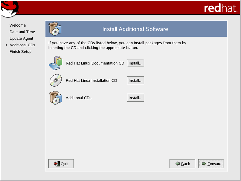 If you want to install Red Hat Linux RPM packages that you did not install during installation, software from third-party providers, or documentation from the Official Red Hat Linux Documentation CD, you can do so at the Install Additional Software screen. Insert the CD containing the software or documentation you want to install, click the Install... button, and follow the instructions.