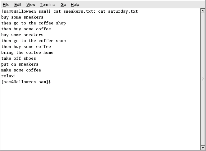 [sam@halloween sam]$cat sneakers.txt buy some sneakers then go to the coffee shop then buy some coffee bring the coffee home take off shoes put on sneakers make some coffee relax! [sam@halloween sam]$ |