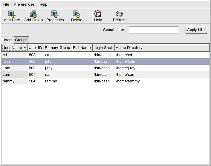 You can also start the User Manager by typing redhat-config-users at a shell prompt.