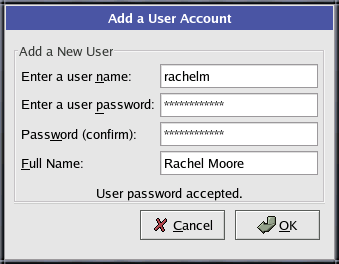 Click the Add button to add a new, non-root, user. Enter a user name for the user account. Next, enter and confirm a password for that user account. Enter the full name of the account user and click OK. Your account information will be added to the account list.