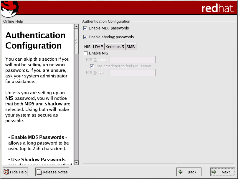 Unless you are setting up NIS authentication, you will notice that only MD5 and shadow passwords are selected (see Figure 3-24). We recommend you use both to make your machine as secure as possible.