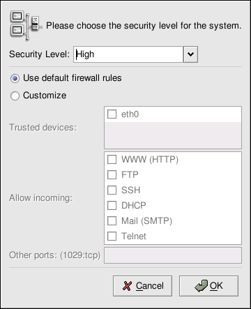 After installation, you can change the security level of your system by using Security Level Configuration Tool. If you prefer a wizard-based application, refer to the Section called GNOME Lokkit.