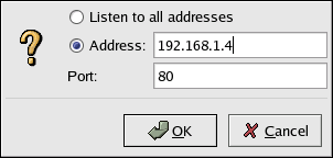 Use the Available Addresses area to define the ports on which the server will accept incoming requests. This option corresponds to the Listen directive in httpd.conf. By default, Red Hat configures the Apache HTTP Server to listen to port 80 for non-secure Web communications. Click the Add button to define additional ports on which to accept requests. A window as shown in Figure 18-2 will appear. Either choose the Listen to all addresses option to listen to all IP addresses on the defined port or specify a particular IP address over which the server will accept connections in the Address field. Only specify one IP address per port number. If you want to specify more than one IP address with the same port number, create an entry for each IP address. If at all possible, use an IP address instead of a domain name to prevent a DNS lookup failure. Refer to http://httpd.apache.org/docs-2.0/dns-caveats.html for more information about Issues Regarding DNS and Apache. Entering an asterisk (*) in the Address field is the same as choosing Listen to all addresses. Clicking the Edit button shows the same window as the Add button except with the fields populated for the selected entry. To delete an entry, select it and click the Delete button.