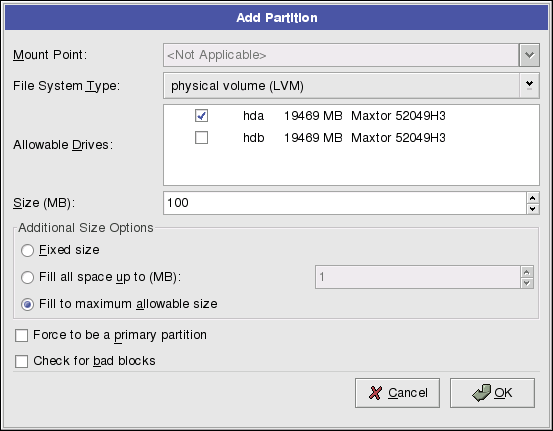 Select Fixed size to make the physical volume the specified size, select Fill all space up to (MB) and enter a size in MBs to give range for the physical volume size, or select Fill to maximum allowable size to make it grow to fill all available space on the hard disk. If you make more than one growable, they will share the available free space on the disk.