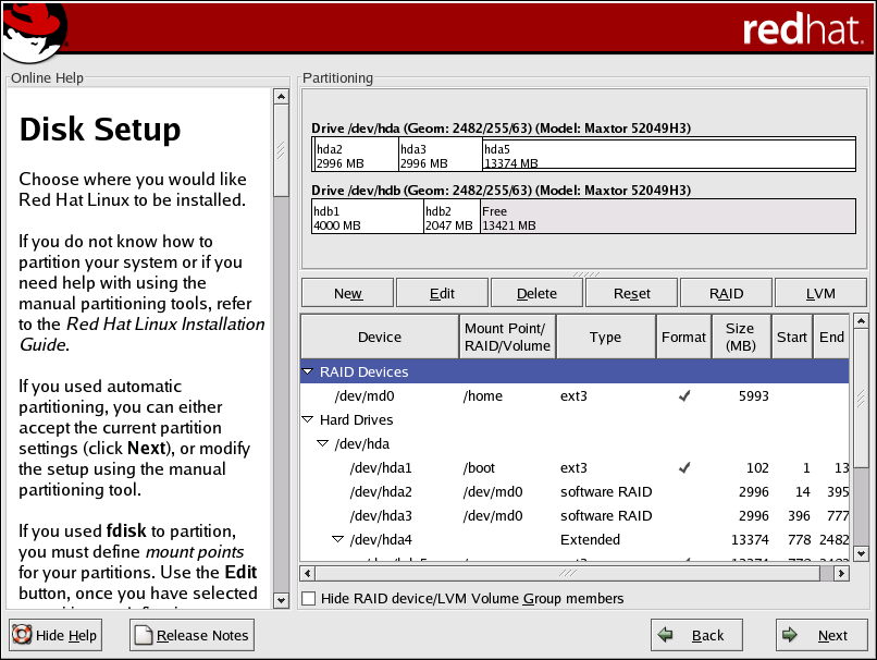 Software RAID can be configured during the graphical installation of Red Hat Linux or during a kickstart installation. You can use fdisk or Disk Druid to create your RAID configuration, but these instructions will focus mainly on using Disk Druid to complete this task.