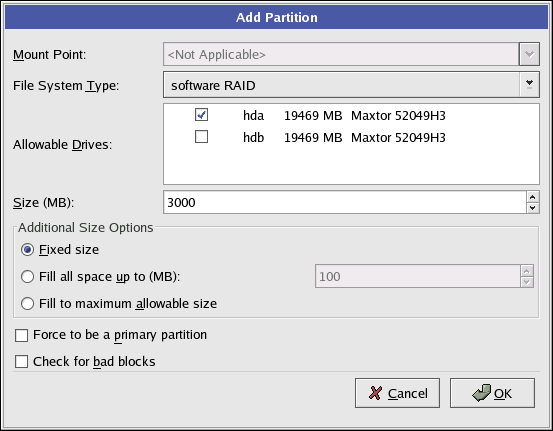If you are making a RAID partition of /boot, you must choose RAID level 1, and it must use one of the first two drives (IDE first, SCSI second). If you are not creating a RAID partition of /boot, and you are making a RAID partition of /, it must be RAID level 1 and it must use one of the first two drives (IDE first, SCSI second). |