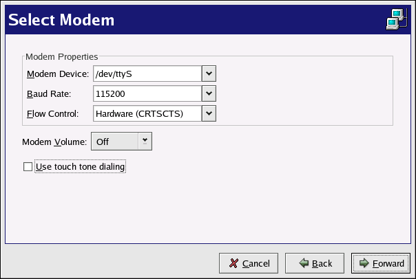 Configure the baud rate, flow control, and modem volume. If you do not know these values, accept the defaults. If you do not have touch tone dialing, uncheck the corresponding checkbox.