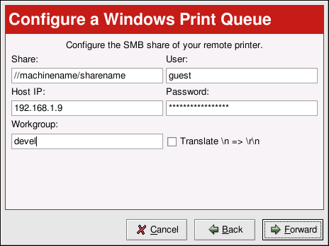 Share — The name of the shared printer on which you want to print. This name must be the same name defined as the Samba printer on the remote Windows machine. Notice the syntax of //machinename/sharename.