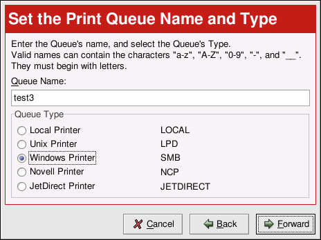 To add a printer which is accessed using the SMB protocol (such as a printer attached to a Microsoft Windows system) click the New button in the main Printer Configuration Tool window. The window shown in Figure 26-2 will appear. Click Next to proceed.