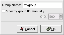 To add a new user group, click the New Group button. A window similar to Figure 24-4 will appear. Type the name of the new group to create. To specify a group ID for the new group, select Specify group ID manually and select the GID. Red Hat Linux reserves group IDs lower than 500 for system groups.