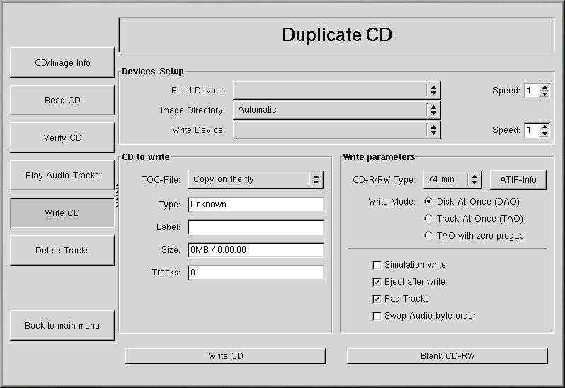 To duplicate an existing CD-ROM for backup purposes, click the Duplicate CD button in the main panel. You can read all of the tracks on a CD — all CD-ROM information, including data and audio, is stored on tracks — by clicking Read CD. You can set the speed at which you read a CD-ROM as well as find out some information about the CD-ROM track such as its type and size. If you are copying tracks from an audio CD, you can preview each track with Play Audio-Tracks. Since X-CD-Roast reads all tracks of a CD-ROM by default, you can delete unwanted tracks with Delete Tracks.