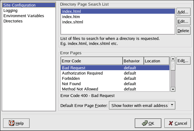 Use the Error Code section to configure Apache HTTP Server to redirect the client to a local or external URL if the event of a problem or error. This option corresponds to the ErrorDocument directive. If a problem or error occurs when a client tries to connect to the Apache HTTP Server, the default action is to display the short error message shown in the Error Code column. To override this default configuration, select the error code and click the Edit button. Choose Default to display the default short error message. Choose URL to redirect the client to an external URL and enter a complete URL including the http:// in the Location field. Choose File to redirect the client to an internal URL and enter a file location under the document root for the Web server. The location must begin the a slash (/) and be relative to the Document Root.
