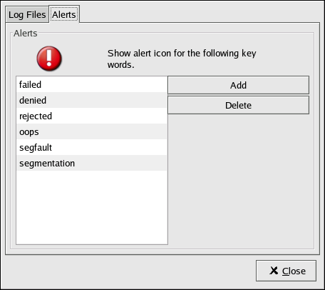 Log Viewer can be configured to display an alert icon beside lines that contain key alert words. To add alerts words, select Edit => Preferences from the pull-down menu, and click on the Alerts tab. Click the Add button to add an alert word. To delete an alert word, select the word from the list, and click Delete.