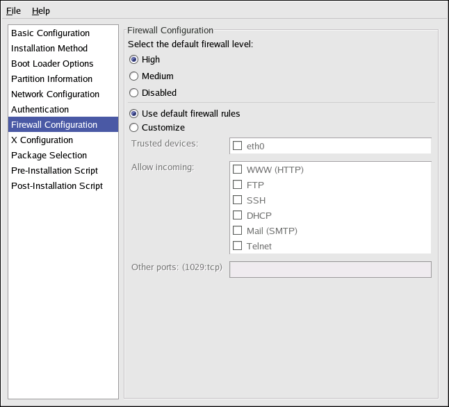 The Firewall Configuration window is identical to the screen in the Red Hat Linux installation program and the Security Level Configuration Tool, with the same functionality. Choose between High, Medium, and Disabled security levels. Refer to the Section called Security Level Configuration Tool in Chapter 12 for detailed information about these security levels.