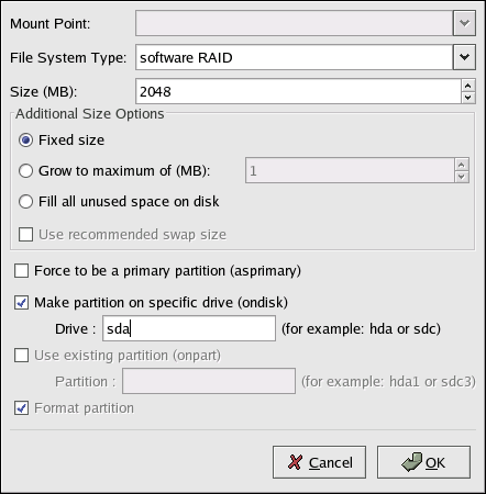 Configure the partitions as previously described, except select Software RAID as the file system type. Also, you must specify a hard drive on which to make the partition or an existing partition to use.