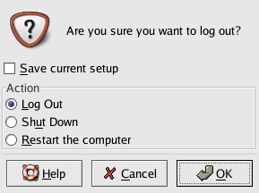 When you have finished working and want to quit GNOME, you are presented with the choice of simply logging out of GNOME (leaving the system running), restarting the machine, or halting the system completely.