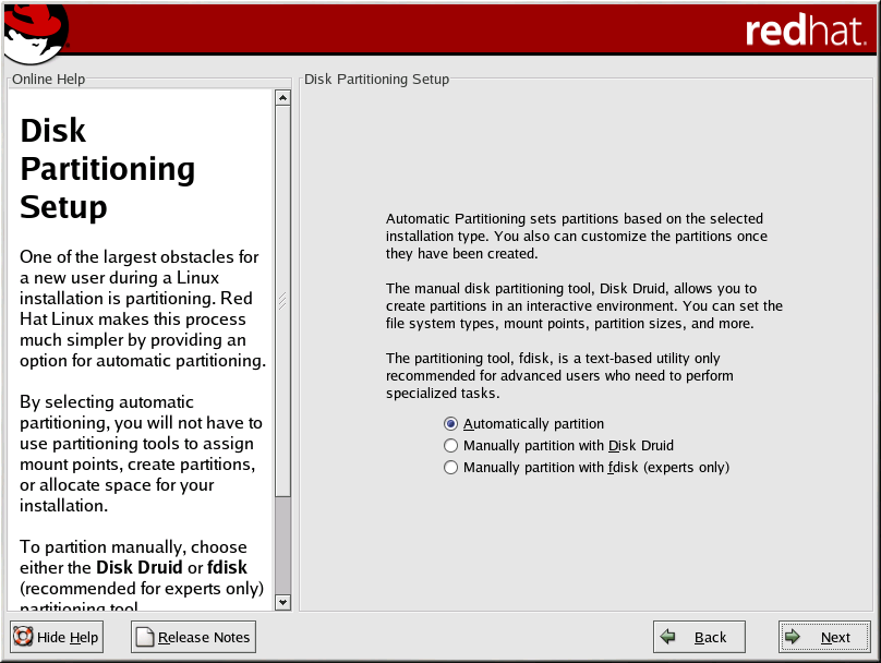 On this screen, you can choose to perform automatic partitioning, or manual partitioning using Disk Druid or fdisk (see Figure 3-11).
