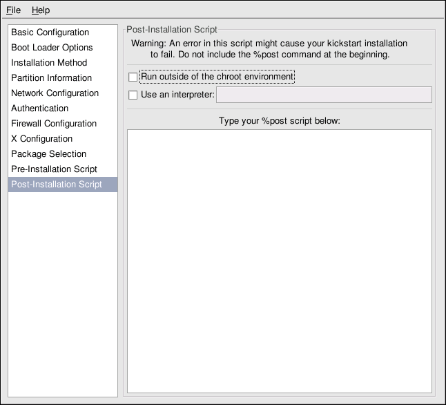 If you want to specify a scripting language to use to execute your script, click the Use an interpreter button and enter the interpreter in the text box beside the button. For example, /usr/bin/python2.2 can be specified for a Python script. This option corresponds to using %post --interpreter /usr/bin/python2.2 in your kickstart file.