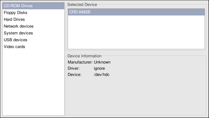 If you are having trouble configuring your hardware or just want to know what hardware is in your system, you can use the Hardware Browser application to display the hardware that can be probed. To start the program from the desktop, select Main Menu Button => System Tools => Hardware Browser or type hwbrowser at a shell prompt. As shown in Figure 25-3, it displays your CD-ROM devices, floppy disks, hard drives and their partitions, network devices, pointing devices, system devices, and video cards. Click on the category name in the left menu, and the information will be displayed.